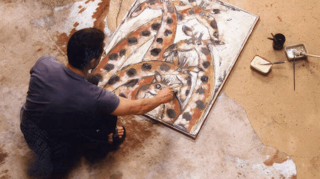 Herve grew up in the Southern Mediterranean region and nothing predestined him for an artistic career. He began his working life rather chaotically and carried out various professions before working in metallurgy for 8 years. It was only by chance that he began to paint. On moving house and decorating his apartment, he looked for art based on animals, but finding nothing, he began creating and decorating the walls with his own paintings. His family then discovered his talent and encouraged him to do become an artist. Various meetings and collaborations with decoration businesses gave Hervé the opportunity to paint freely and exhibit for the first time. He contributed to another artist’s ceramics work and the experience convinced him to embark on an artistic career. More fabulist than naturist, Hervé endows his animal characters with complexity, transforming the bestiary inherited from the medieval tradition, rock paintings and Far Eastern Art.